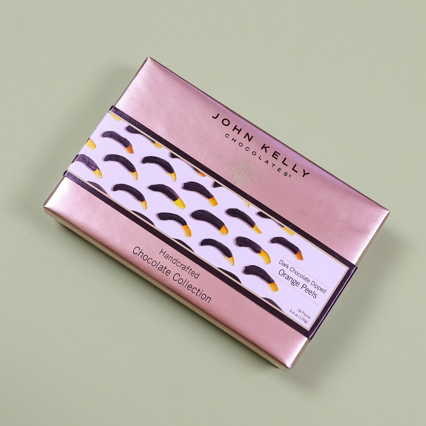 Dark Chocolate Dipped Orange Peel Gift Box: Perfect for sharing, this gift box contains 18 glace orange peels coated in dark chocolate. Vegan.