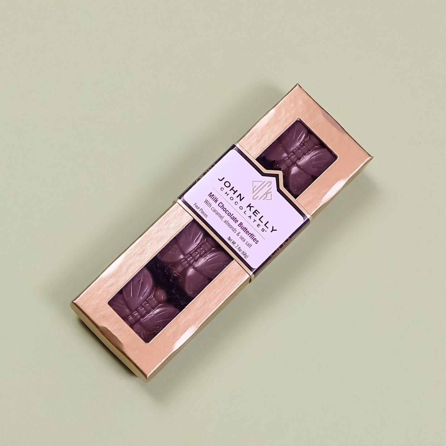 4-Piece Milk Chocolate Butterflies: A delightful box of four hand-molded butterflies in milk chocolate, filled with a luscious blend of roasted crushed almonds, sea salt, and buttery caramel.