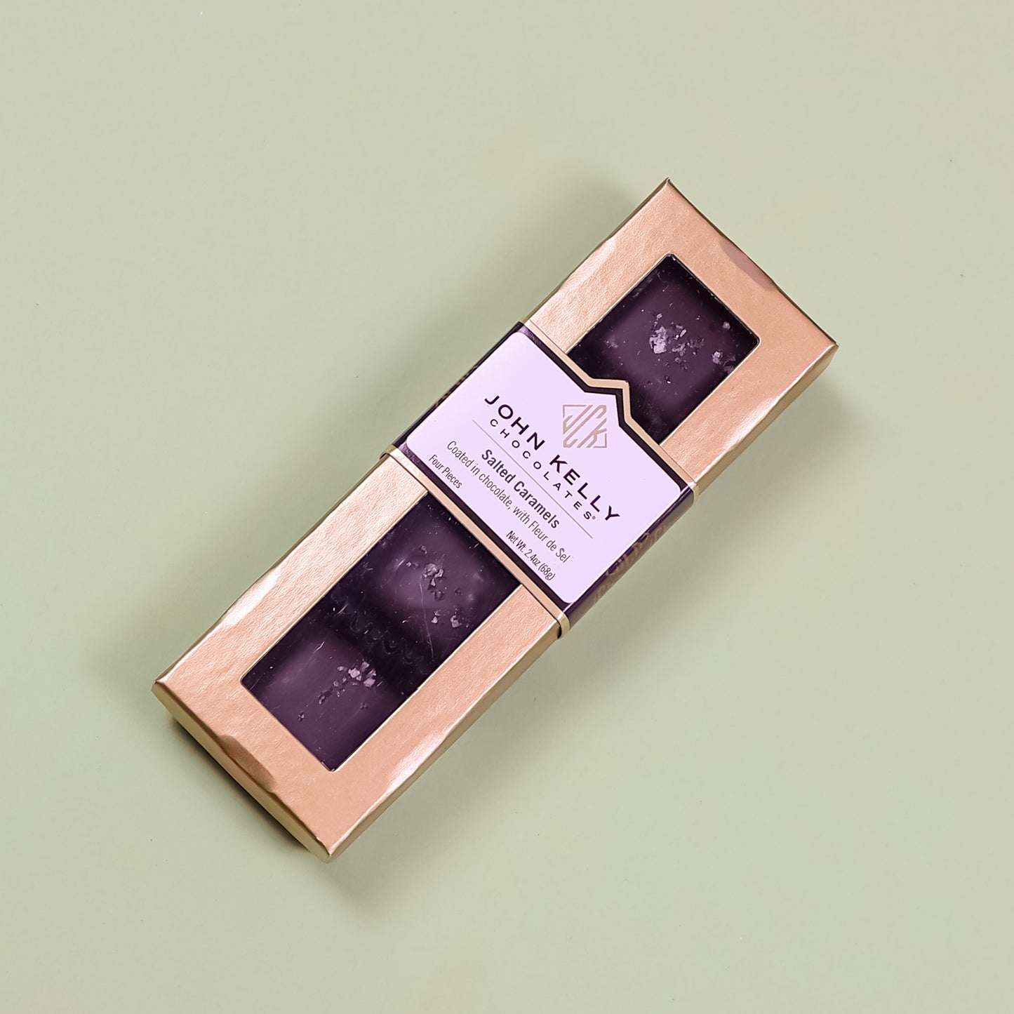 4-Piece Fleur de Sel Salted Caramels: A luxuriously packaged box of four handcrafted chewy vanilla butter caramels, coated in semi-sweet chocolate and topped with Fleur de Sel.