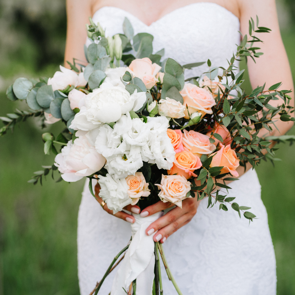 This romantic garden-style bridal bouquet features a dreamy blend of soft peach roses, ivory lisianthus, and delicate white peonies, accented with fresh eucalyptus and lush greenery. Hand-tied with a flowing white ribbon, this bouquet strikes the perfect balance of elegance and natural charm. Its airy, organic shape makes it ideal for brides who love a timeless yet modern look, beautifully complementing any classic or outdoor wedding setting.