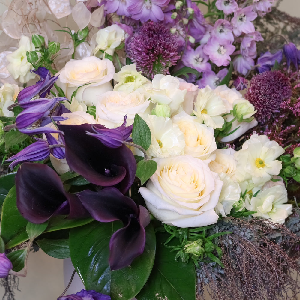 Composed of ivory and cream garden roses, lavender delphinium, purple clematis, deep plum calla lilies, and textural allium, layered with magnolia foliage and premium seasonal greenery — this design evokes movement and stillness at once. The soft transitions between light and dark tones create a sense of melancholic calm, like the world pausing before the rain begins. A luxurious, atmospheric piece that commands attention through its depth, height, and emotional resonance.