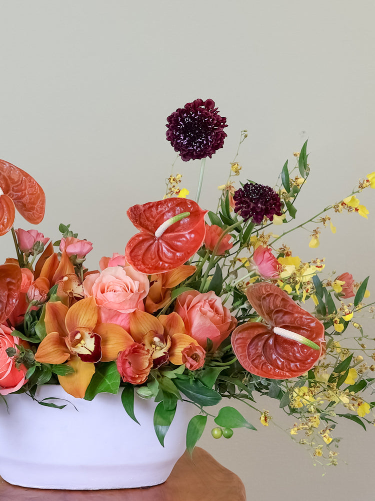 A warm, sculptural centerpiece designed to capture the essence of fall. This all-around arrangement features Oncidium orchids, vibrant anthuriums, golden cymbidium orchids, lush roses, delicate scabiosa, and premium greenery. Measuring approximately 24 inches long, 15 inches high, and 10 inches wide, Golden Ember brings a mystical, airy feel to any setting — ideal for a dining table, console, or coffee table.